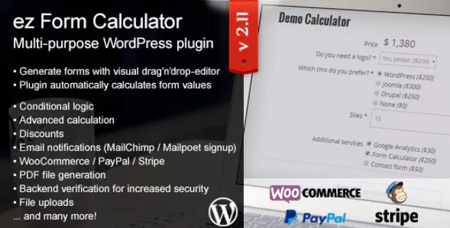 ez Form Calculator v2.11.2.1 is an intuitive multi-purpose form creator plugin for WordPress. With this plugin you can create simple form calculators, advanced cost estimators or extensive contact forms for both yourself and your customers. This plugin easily add basic form elements like checkboxes, dropdown menus, radio buttons etc. with only a few clicks. for more information about this WordPress plugin please click On Demo Button.
