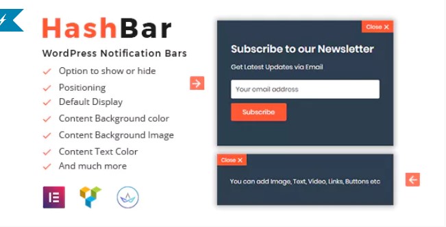 HashBar Pro v1.0.17 is a WordPress Notification / Alert / Offer Bar plugin that allows you to create unlimited notification bars to notify your customers. This plugin has option to show email subscription form, Offer text and buttons about your promotions. The HashBar Pro plugin has the options to add unlimited background colors and images to make your notification bar more professional. for more information about this WordPress plugin please click On Demo Button.