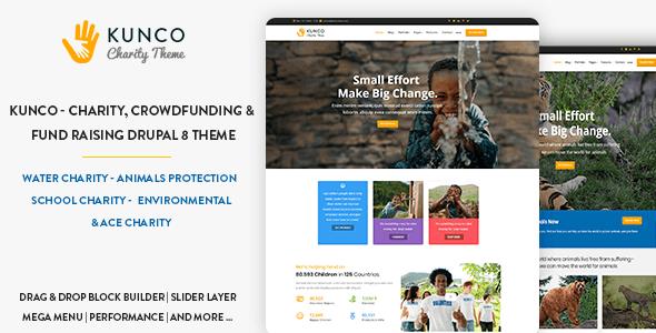Kunco is the best Multipurpose Nonprofit Drupal 8 Theme. It is clean, super flexible, fully responsive, pixel perfect, modern and comes packed with powerful options. Kunco theme is perfect fit for charity, NGO, non-profit organization, donation, church or a fundraising website. You can customize it very easy to fit your needs. Kunco theme is built with Gavias Content Builder, the amazing drag and dop builder allows you build professional block in just some simple clicks. In addition, with over 30+ widgets integrated, building content is never easier. Kunco theme apply the latest web technologies: Drupal 8.7.x, Drupal Commerce 2.x, Bootstrap 3, SASS, HTML5, CSS3, Font Awesome 4 .