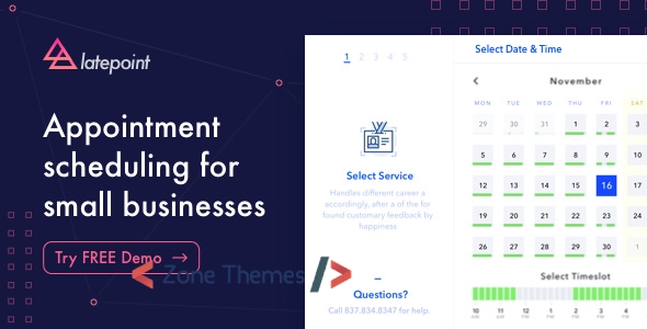 LatePoint v2.2.0 – Appointment Booking zonethemes.info/tag/reservation-wordpress-plugin/">Reservation WordPress Plugin Are you tired of complicated booking software, that takes forever to setup and once you do – it slows down your whole website making you lose your potential customers? Meet LatePoint – our simple and intuitive appointment booking plugin that is focused on your customers, making it incredibly simple to schedule an appointment with just a couple of clicks. We are experts in User Interface design, with 15+ years of experience, tens of thousands of customers are using our products to improve their business.