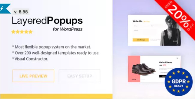 Layered Popups v6.55 is a Premium Popup Plugin for WordPress. With this plugin, you can realize your imagination and make your own unique multi-layers animated popups or use over 200 professionally designed ready-made templates from our library. With this plugin, you can embed AJAX-ed subscription/contact form which works with 86 email marketing providers and collect leads. for more information about this WordPress plugin please click On Demo Button.