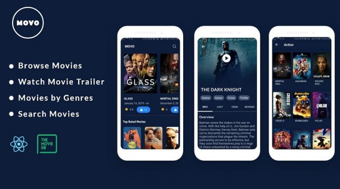 MOVO A React App Source Code for Browse Movies, Watch Movie Trailer, Search your favorite movies. The MOVO app provides features to see the latest movies, top rated movies, upcoming movies. With this app you can check the movie reviews, trailers, basic information, cast, crew.It works on both iOS and Android.