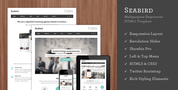 Seabird is a responsive WordPress Theme built with Twitter Bootstrap. It includes 2 different layout options: Side Menu & Top Menu. Seabird features a clean and professional design which can be a great solution for your business, portfolio, personal blog or any other purpose website. The theme is built to be responsive so that it will be compatible on any device such as smart phone, tablet or desktop. 5 premium scripts are included with the total value of $70, which you will get for free with this theme.